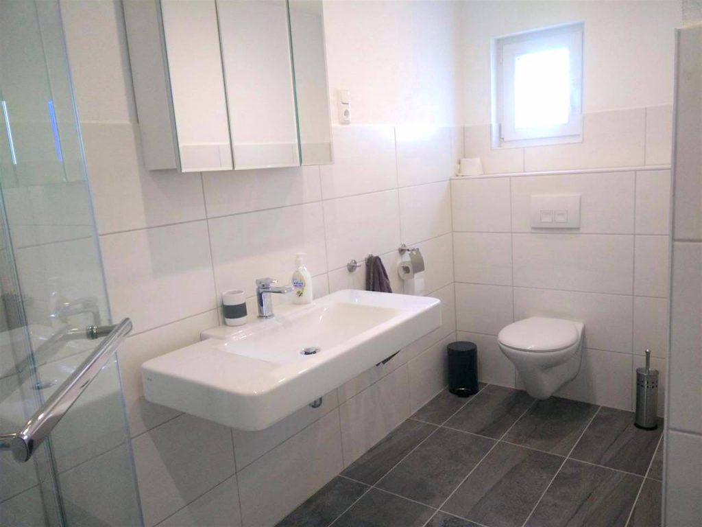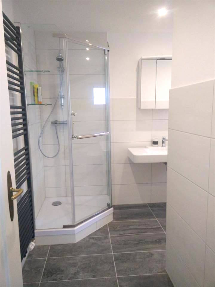 Das moderne Duschbad ist mit allem ausgestattet, was Sie für einen kurzen Aufenthalt benötigen: Handtücher, Duschgel, Seife, WC-Papier und ein Haarfön. Eine Waschmaschine steht im Keller zur Mitbenutzung bereit.